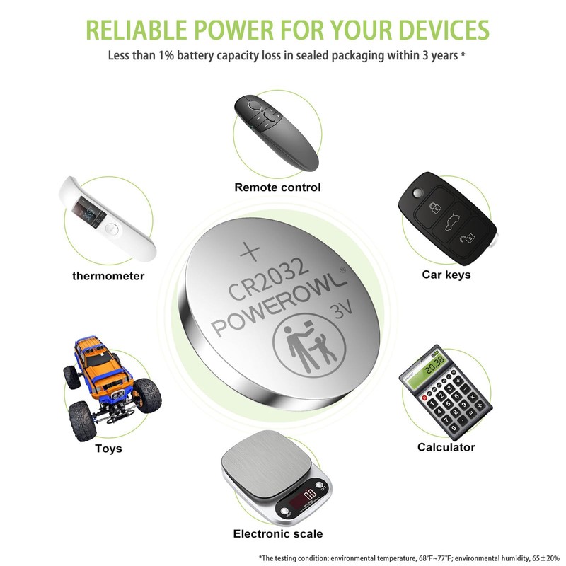 - Performance lithium ion Button Cell Battery: POWEROWL's CR2032 3V batteries provide reliable, long lasting power for your watches, calculators and medical devices