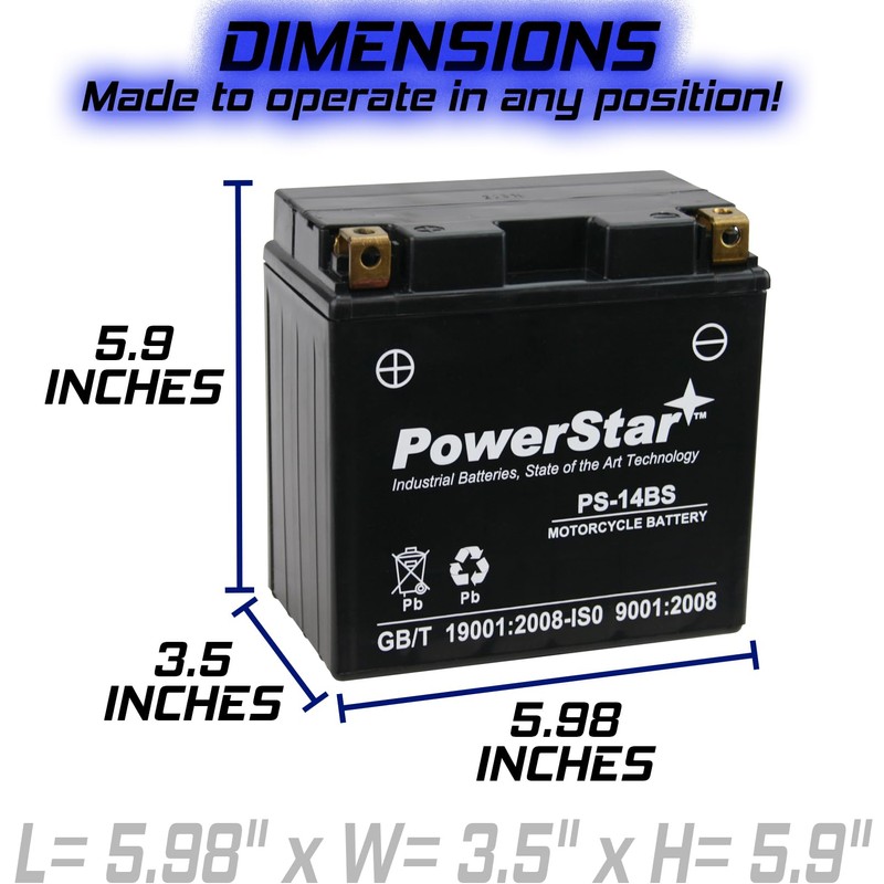 - PowerStar YTX14-BS AGM Sealed Lead Acid battery, features both top and side nut-and-bolt terminals. Comes with 2-Year Warranty Protection- Enjoy long-term peace of mind.