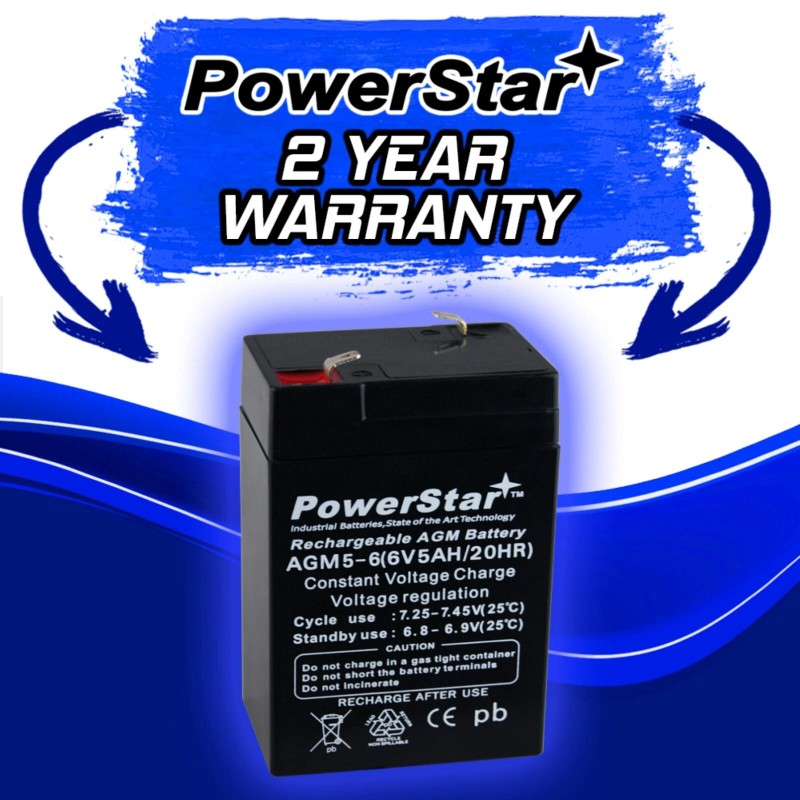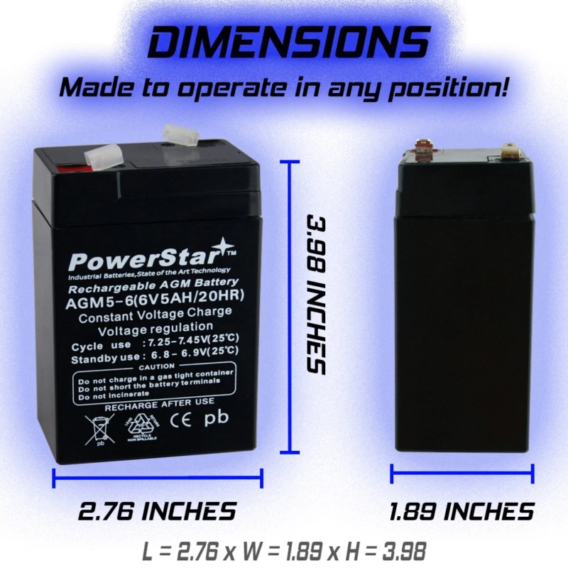 "AGM, 6V,5AH Dimensions(inches) L- 2.76 W- 1.89 H- 3.98. PowerStar Batteries.