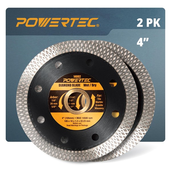 POWERTEC 4 Inch Diamond Saw Blades for Handheld Tile Saw & Angle Grinder 2 Pack, Super Thin Turbo Mesh Rim Blades for Cutting Porcelain, Granite & Ceramic Tile