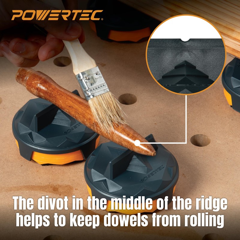- PROTECT YOUR PROJECTS: With minimal surface contact between the finishing bridges and your workpiece, the risk of finish damage is significantly reduced. The divot in the center keeps dowels secure, preventing them from rolling and ensuring consistent support