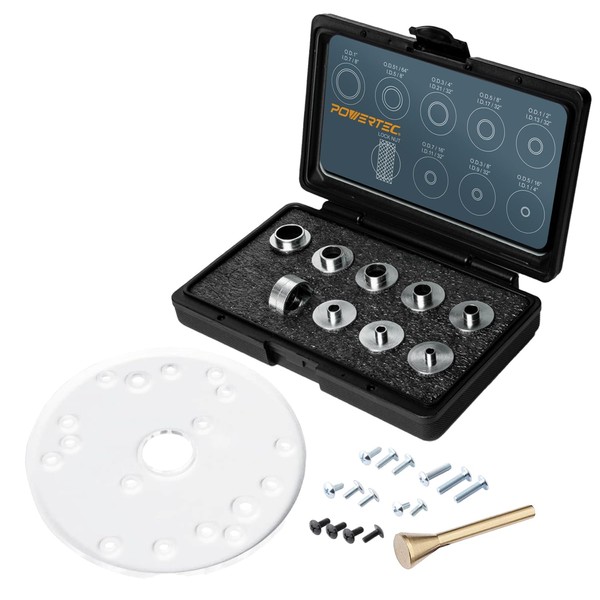 POWERTEC Dia 6-1/2" Router Base Plate & 10Pcs 5/16 to 1" Short Shank Router Template Bushing Guide Sets & Centering Pin. Fits Porter Cable, Craftsman, DeWalt, Bosch, Milwaukee Router Sub Bases (71778)