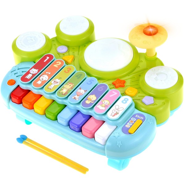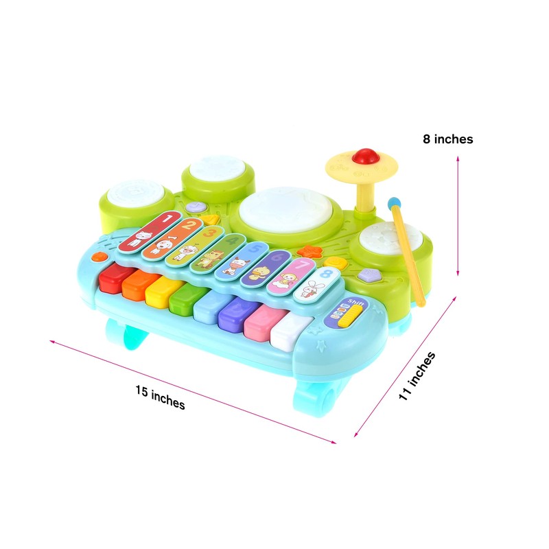 - 3 IN 1 - Full functional musical toy. Contains an electronic piano, xylophone, and a drum set