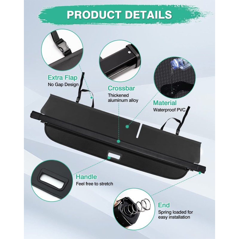 - Easy Install:Retractable for easy cargo access and removal.The retractable cargo area cover conceals your cargo area from view for added peace of mind.