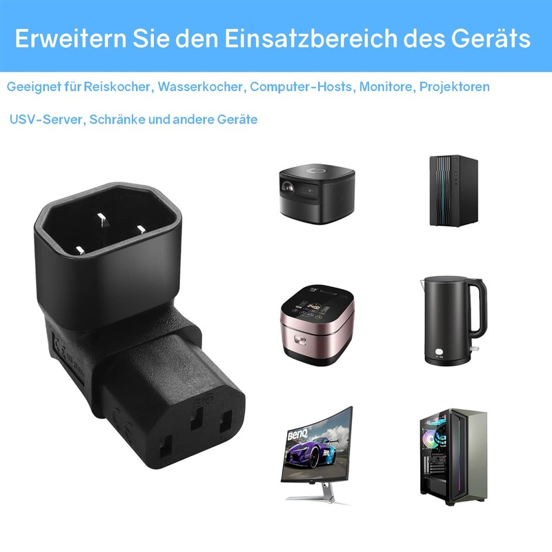 1. IEC 320 C14 to C13 90° right angle AC adapter. Suitable for personal and other household appliances, printers, rice cookers.