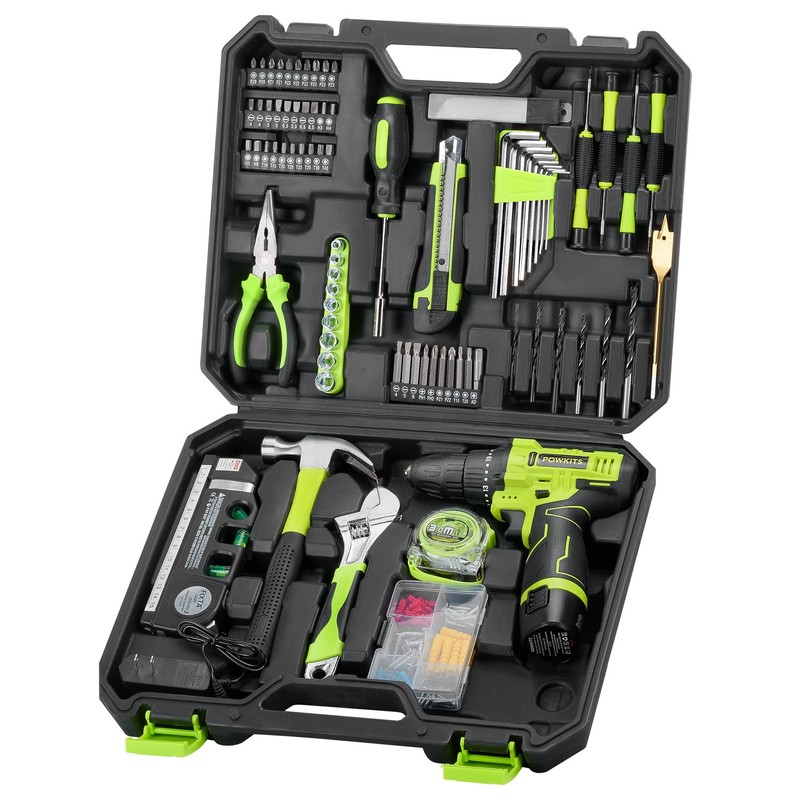 POWKITS Cordless Drill: 12V Power Drill Set with Lithium Battery, 142Pcs Electric Tools Set with 3/8"Keyless Chuck & Laser Level, Portable Household Basic Tool Kit with Too Box for Home, Green