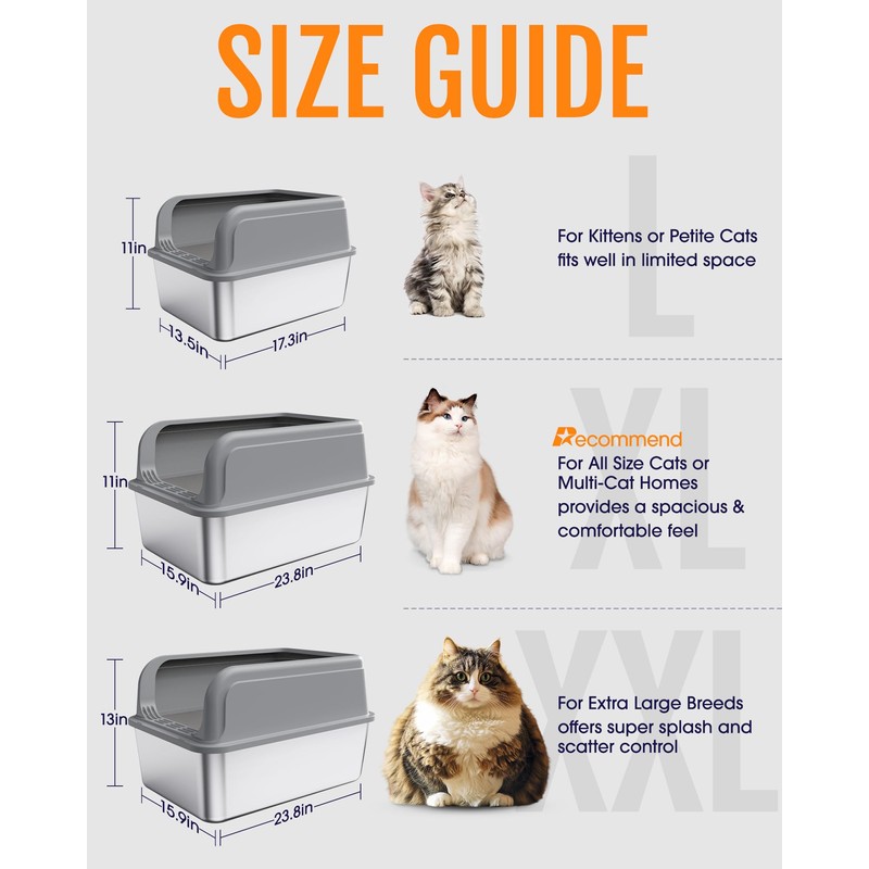 - 3-SIZE OPTIONS MEET YOUR NEEDS: Whether you have a playful kitten or multiple adult cats, this covered litter box offers three size options to meet their needs. L for kittens, XL for all-size cats, and XXL for multi-cat homes. Rest assured that your cats always have ample room to feel safe and comfortable. By offering the right fit, the litter box provides a peaceful, private space that makes your cats happy.