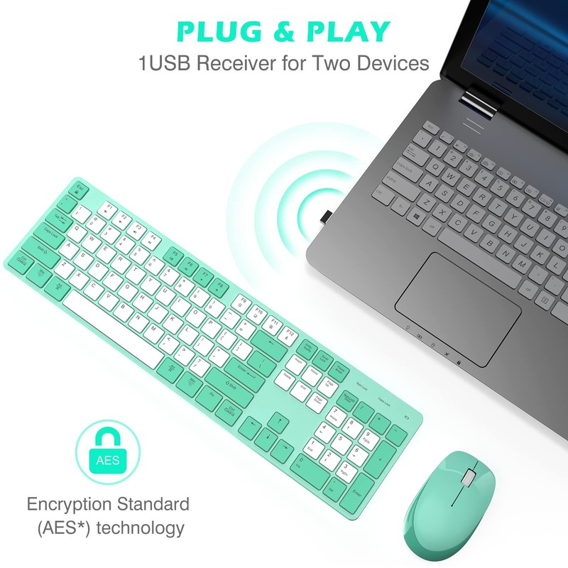 • 【Ultra-Thin Silent Wireless Keyboard and Mouse】 -- Wireless keyboard is in a compact size and is lightweight and full sized design, , save space and be easy to carry. Standard QWERTY layout computer keyboard with num lock/caps lock/power indicator. Individual number pad, arrow keys etc helps you get more work done. Advanced scissor switch whisper-quiet keys design and silent click mouse.