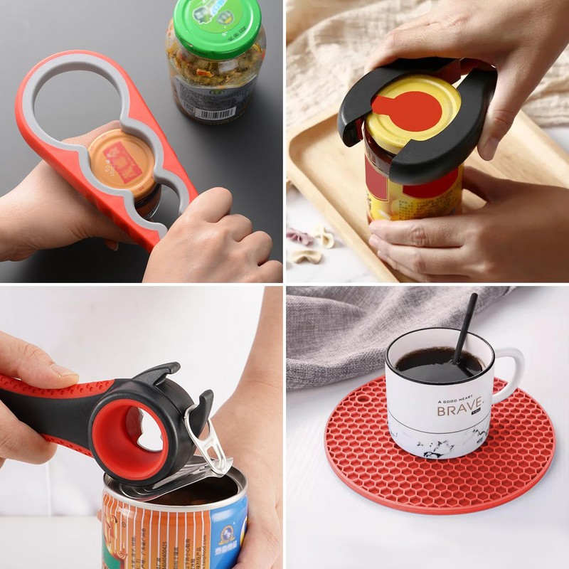 - 【Multifunctional & Versatile】--- Our tin openers are multi-functioned, the big grip opener have 8 circular openings, can open lids max diameter approx 8cm/3.1inch; The other small ones can also open different kinds of bottles, ring pull cans, jars etc; the rubber jar gripper pad can also work as a kitchen coaster, heat insolation mat