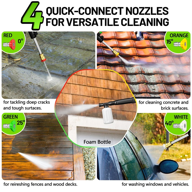 - 【Diverse Accessory Options】The POXURIO electric pressure washer comes with four different quick-connect nozzles and a 450ml foam cannon, providing versatility for various cleaning needs. Whether washing cars, patios, or exterior walls, it handles every cleaning task efficiently with ease.
