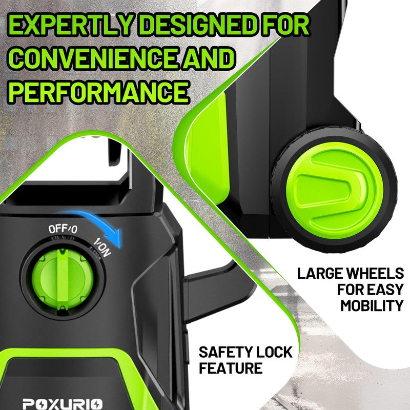 - 【Powerful Cleaning Performance】The POXURIO electric pressure washer is equipped with an upgraded 1800W motor, delivering a maximum water pressure of a flow rate of 2.8 GPM. Whether cleaning large surfaces or tackling stubborn stains, it provides exceptional cleaning performance and is the ideal tool for all your cleaning tasks.