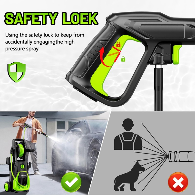 - 【Energy-Saving Safety Shutdown System】This pressure washer is equipped with a Total Stop System (TSS), which automatically shuts off the machine when the trigger is no longer activated and restarts only when the trigger is pressed again. This design helps save energy while extending the life of the motor, ensuring safe and reliable operation.