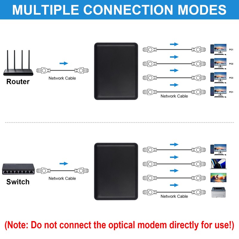 - 【Gigabit RJ45 Splitter Adapter】: Plug ang play, easy to connect, 4 devices can be connected to the Internet at the same time, simple and fast, saving cost. It supports 4 computers sharing a single Ethernet line concurrently with the use of a USB power supply cable. (USB powered, Can not be used without usb powe cable. )