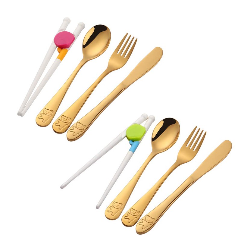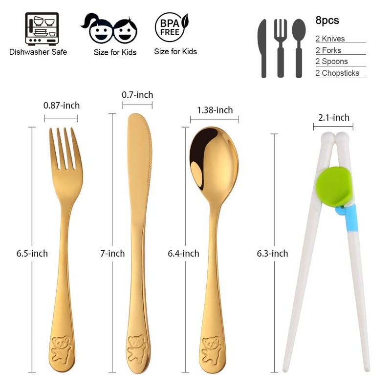 • El juego de cubiertos POYLIM para niños incluye: 2 cuchillos para niños, 2 tenedores para niños, 2 cucharas para niños, 2 palillos de entrenamiento. El juego de cubiertos Poylim para niños contiene palillos infantiles fáciles de usar, permite a los niños disfrutar de la diversión de usar palillos y ser más conveniente para probar las delicias de diferentes países, como sushi, bolas de arroz.