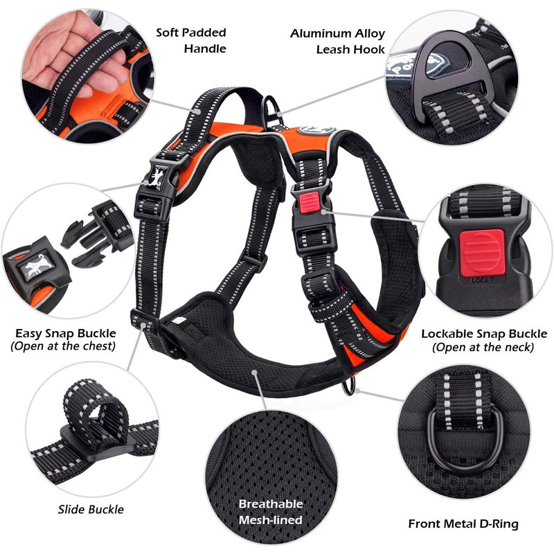 - NEW VERSION, SUPER EASY TO USE: This no pull dog harness has 2 easy buckles on belly straps and 1 more lockable Quick-snap buckle on neckline for easy on and off, no need to slip over dog’s head and adjust the straps every time.