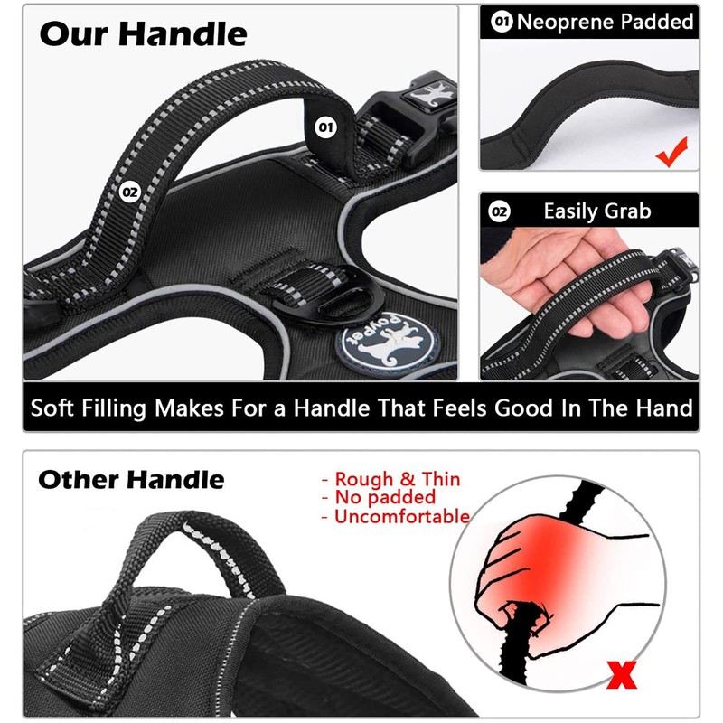 - TOP HANDLE FOR EXTRA CONTROL - The handle on the harness is sturdy and allows you to support dogs when jumping into the back of the truck or holding them when pulling to other dogs without causing discomfort. It helps to hold dogs quickly.