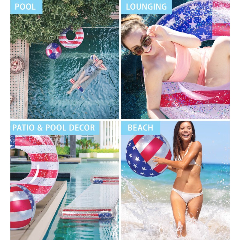 • IDEAL USE FOR THE USA FLAG INFLATABLE SET OF ADULTS AND KIDS POOL FLOATS - Enjoy summer days with these fun pool floats perfect for kids and adults. The USA pool float ring, hammock, and American flag beach balls are your go-to accessories for your 4th of July pool party supplies to make your patriotic party more exciting, or use these cool pool floats for adults and kids as your summer pool party decor to give off sparkly 4th of July vibes.