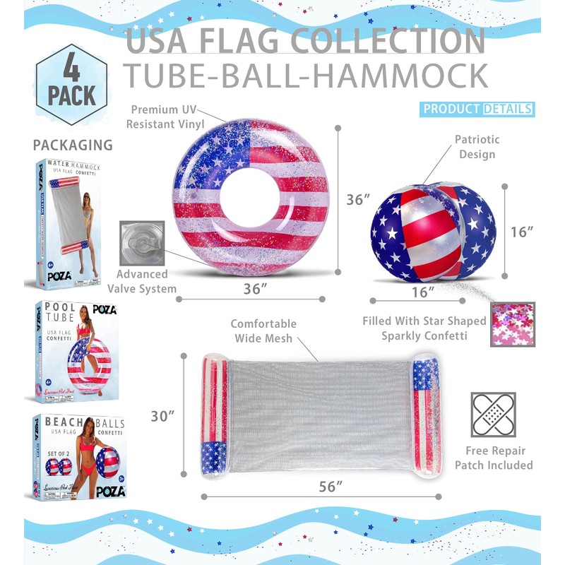 • INCLUDED WITH THE PURCHASE OF BUNDLE OF POOL INFLATABLES - Includes POZA Bundle of Pool Inflatables, including 2 Large USA Beach Balls in 16x16 inches, 1 Swim Ring Float in 36x36x9 inches, and 1 Water Hammock with comfortable wide mesh lining for multipurpose usage in 56x30x5 inches. Each pool inflatable accessory is designed with patriotic USA flag, filled with sparkly star confetti inside and comes with a repair patch for each beach floats.
