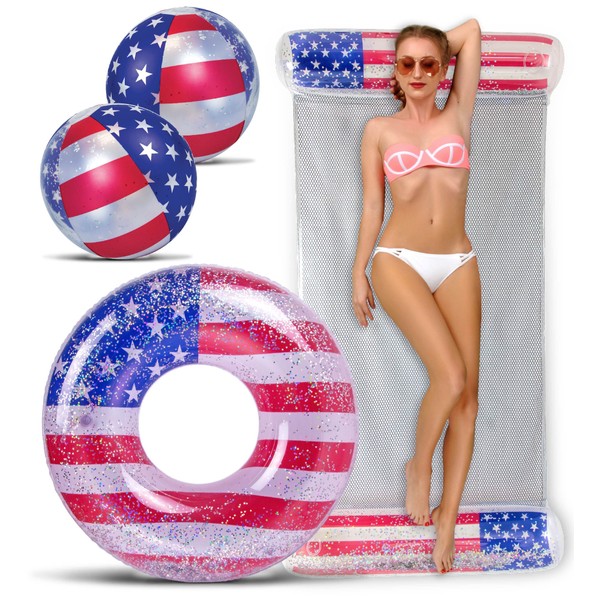 • THE AMERICAN POOL FLOAT BUNDLE COME WITH UNIQUE DESIGN YOU WILL LOVE - A sparkly red white and blue pool float set of swim tube, hammock, and patriotic beach balls will make a big splash of fun at any pool party or beach outing. Each piece embodies the spirit of American pride, perfect for 4th of July pool games or on Memorial Day. The lightweight design of these bundle of party pool floats makes them great beach inflatables for kids and adults.
