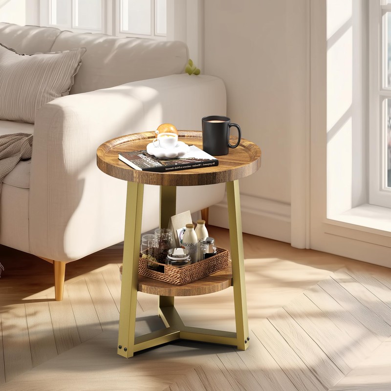 PPAMAPIC Round End Table, 2 Tier Side Table with Storage Shelf, Nightstand Accent Table for Living Room Bedroom Small Space, Golden Metal Frame, 15.7" D x 19.7" H, Rustic Brown