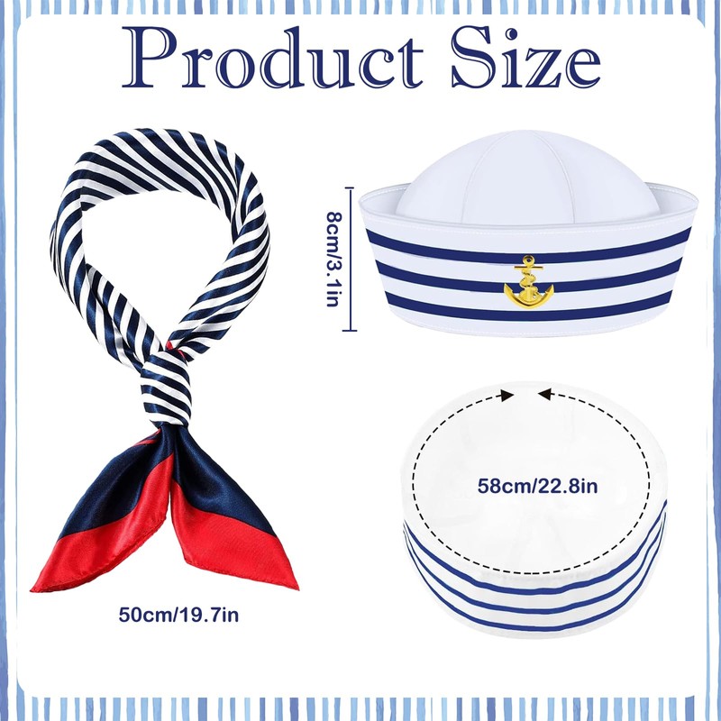 - The right size: the sailor hat has a circumference of approx. 22.8 inches/58 cm and a height of 3.1 inches/8 cm, and the scarf measures 19.7 x 19.7 inches/50 x 50 cm, suitable for most adults and children, can be used with bobby pins to secure smaller heads, and the scarf can be used around the neck, wrists, head, hair and more.
