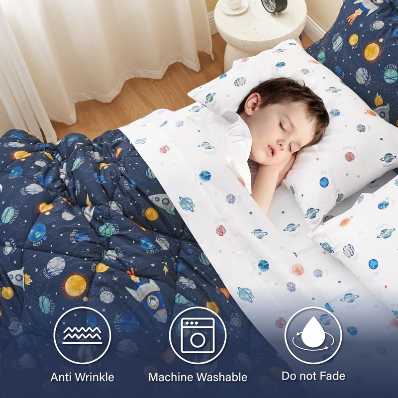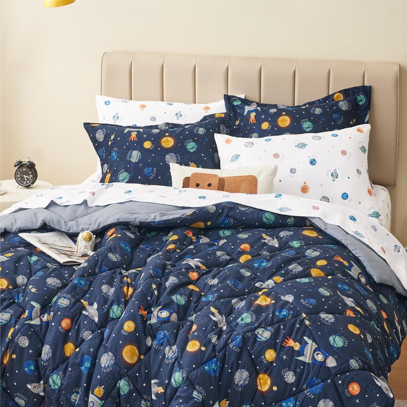 Kids Comforter Set with Sheet: Twin size comforter set includes 1 pillowcases 20"x30", 1 pillow shams 20"x26", 1 flat sheet 96"x66", 1 fitted sheet 75"x39"x14", 1 comforter 66"x86"; Queen size comforter set includes 2 pillowcases 20"x30", 2 pillow shams 20"x26", 1 flat sheet 102"x90", 1 fitted sheet 80"x60"x14", 1 comforter 88"x88". Soft Comforter Set: This printed twin space bedding set is crafted from microfiber and filled with 200 grams of premium fill, it's breathable and warm, like sleeping on a cloud. Lightweight and suitable for all year use. Cute Space Bedding Design for Kids: This children's bedding set adopts the cute image of space, which is vivid and funny. Let your children feel like they are in a space paradise, accompany them to spend a wonderful night. Easy Care: Our kids space comforter twin set is fade and wrinkle resistant,durable and machine washable. To clean, cold hand or machine wash on a gentle cycle.To dry,air/tumble dry on low.Do not bleach. Great Gift: The adorable style will keep comfortable, and it also can inspire children's desire to explore and develop their imagination and creativity. Let your child soar freely in the world of mermaid and start a marvelous adventure!