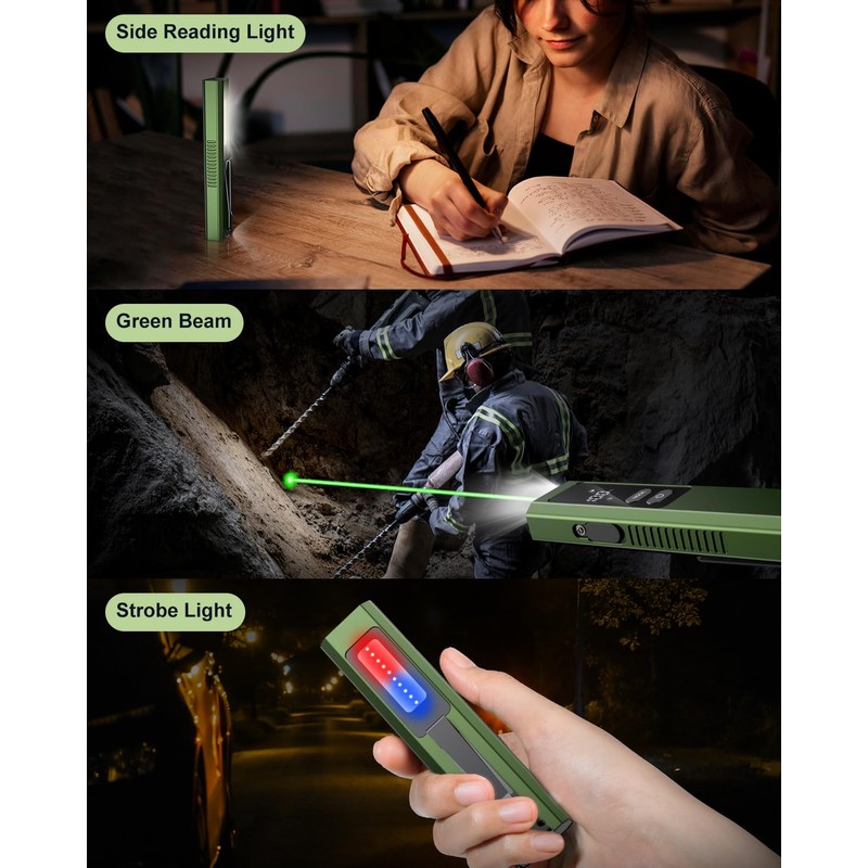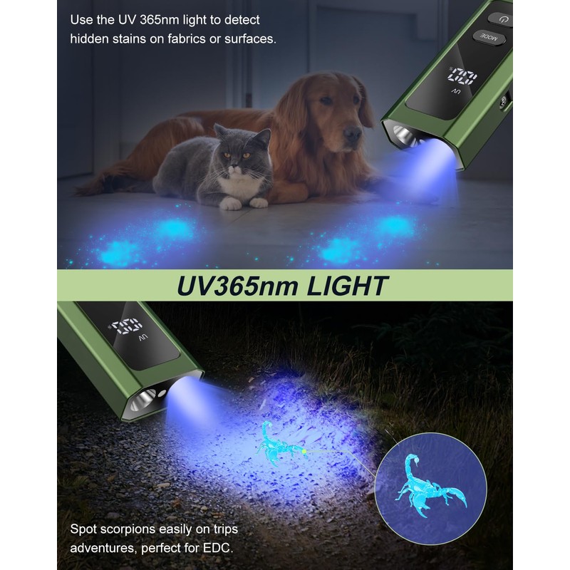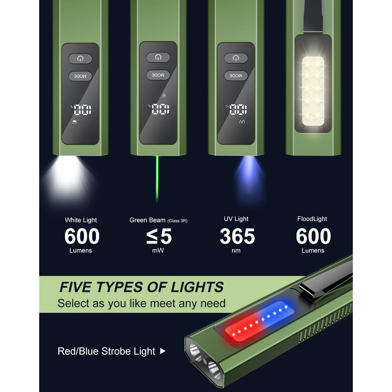 • 4 Unique Light Sources: 600 lumen main white light for bright illumination, green light (<5mW) for precise pointer, UV light (365nm) for detection, 600 lumen side warm light with red/blue flashing for emergency signals. Ideal for daily carry and various tasks.