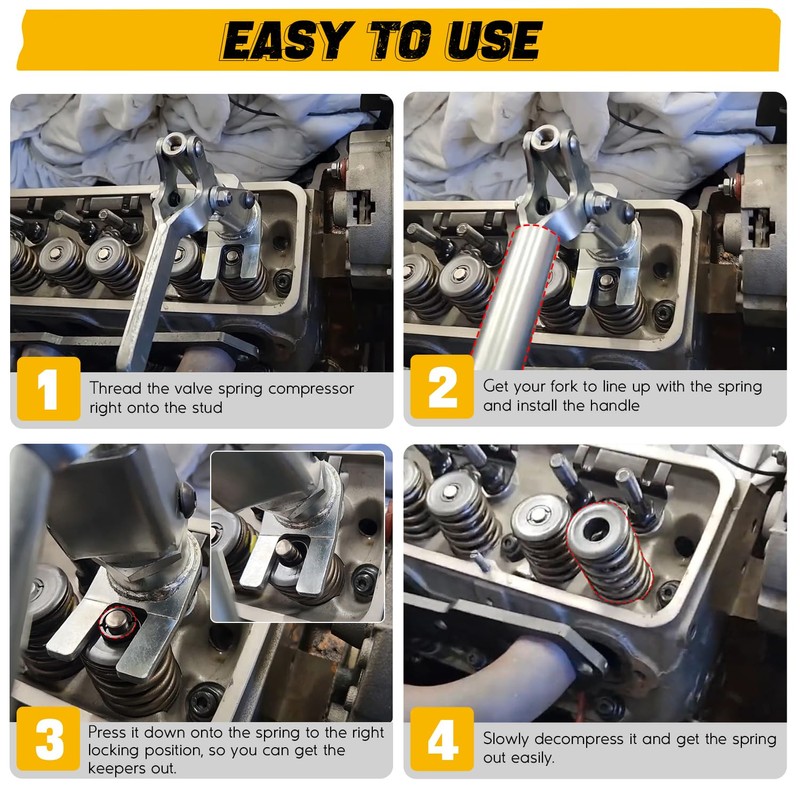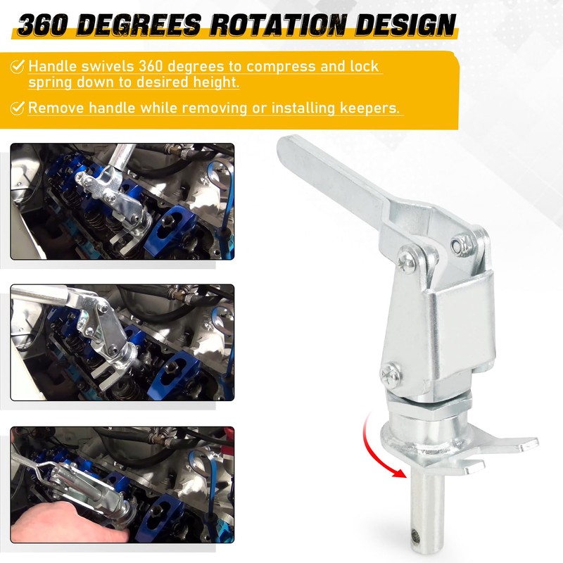 - 360 Degrees Rotation Design: Handle swivels 360 degrees to compress and lock spring down to desired height and remove handle while removing or installing keepers. Press down to compress coil spring, then remove valve keepers.