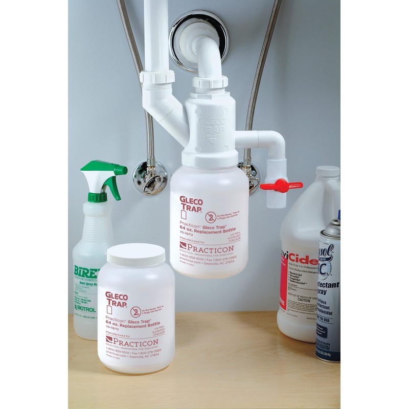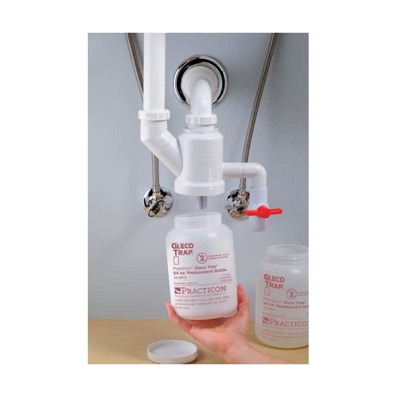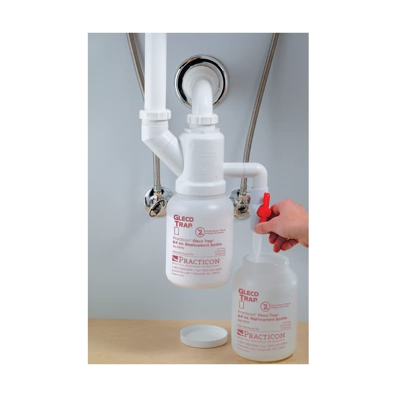 Invented by a plumber, the 64 oz. Gleco Trap System brings revolution to the age-old chore of sink trap retrieval and plaster trap maintenance. No more leaky bags or bulky buckets. Install the pre-assembled Gleco Trap once, then replacing the bottle takes less than one minute start to finish without tools. Simply turn side valve to drain off excess water, unscrew full bottle, screw in a clean one.