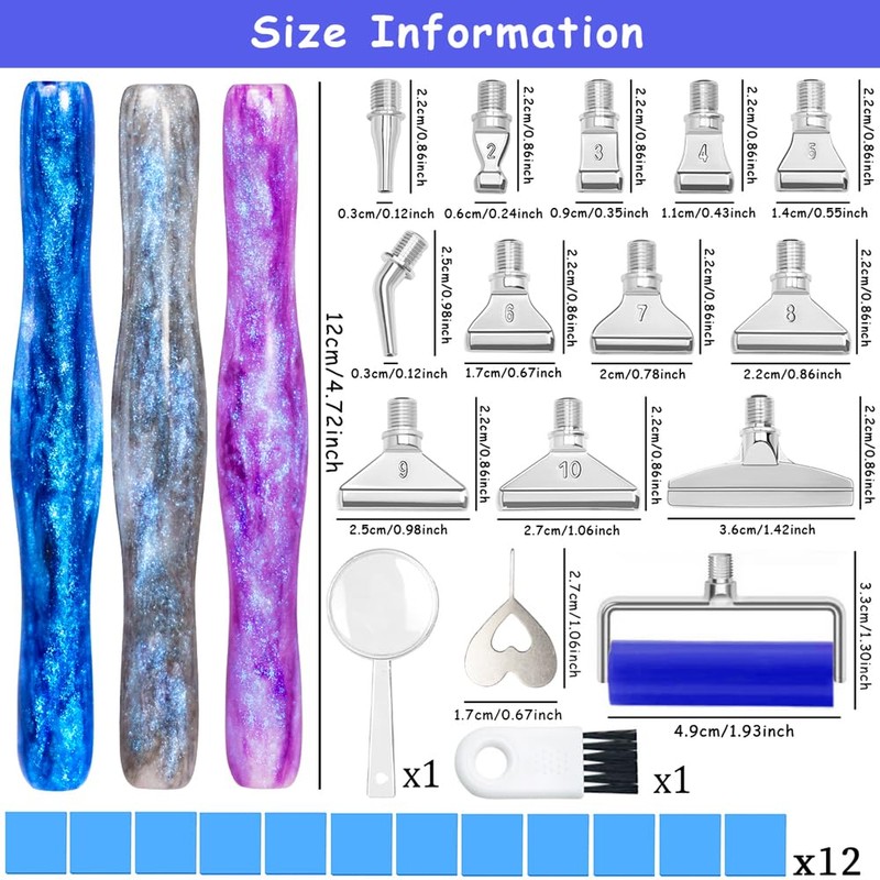 - 【Diamond Painting Pen Kit Package include】3Pc Diamond painting pen, 12Pcs Stainless steel diamond painting pen metal tips in different sizes,1 diamond painting roller ,12 pieces waxes, 1Pc wax cleaning pin,1Pc bead spread brush, 1Pc 9*4cm magnifier(3x magnification)