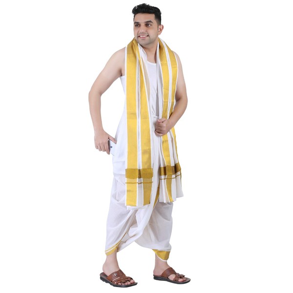PRAKASAM COTTON Men's Panjakejam (Ready to wear) dhoti towel set with pocket- free size., White, Free