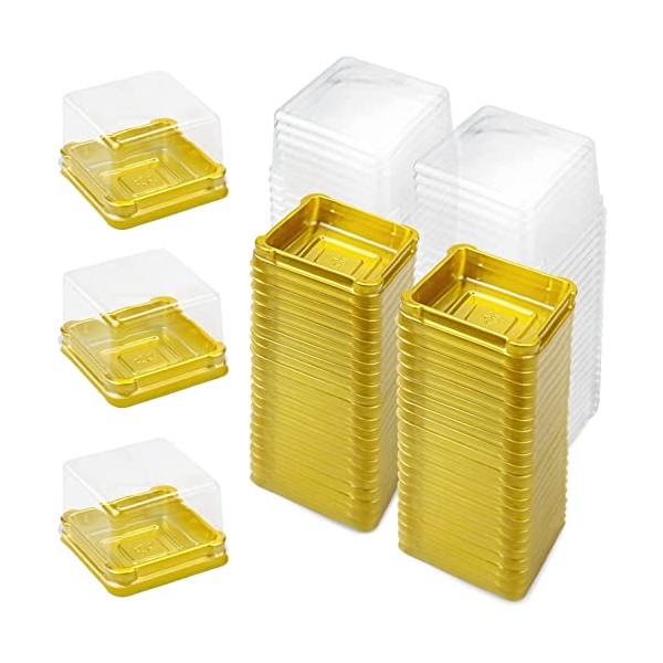 Pralb 100 Set Clear Plastic Mini Cupcake Boxes Muffin Pod Dome Muffin Single Container Box Wedding Birthday Gifts Supplies for Cheese Pastry Dessert Mooncake (square, gold)