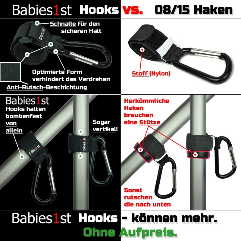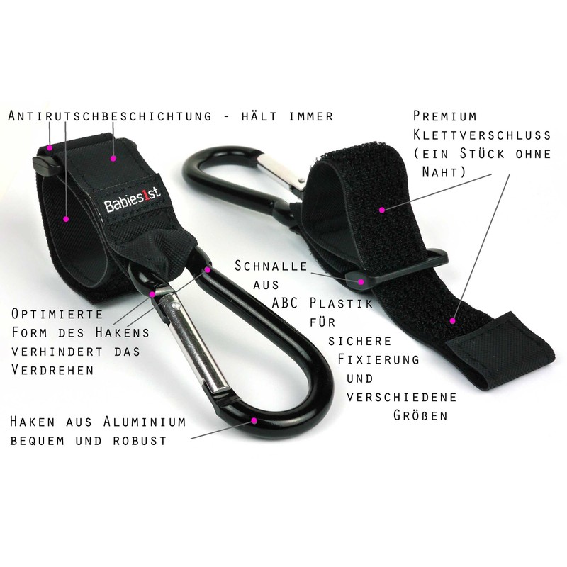 Thanks to the buckle and premium Velcro fastener with non-slip coating, hooks for pram black hooks hold securely even on inclined and even vertical elements. Optimised shape of carabiner prevents annoying turning. Black Hooks are ideal as a pram trailer and suitable for prams, buggies and all bags, changing bags and changing backpack.