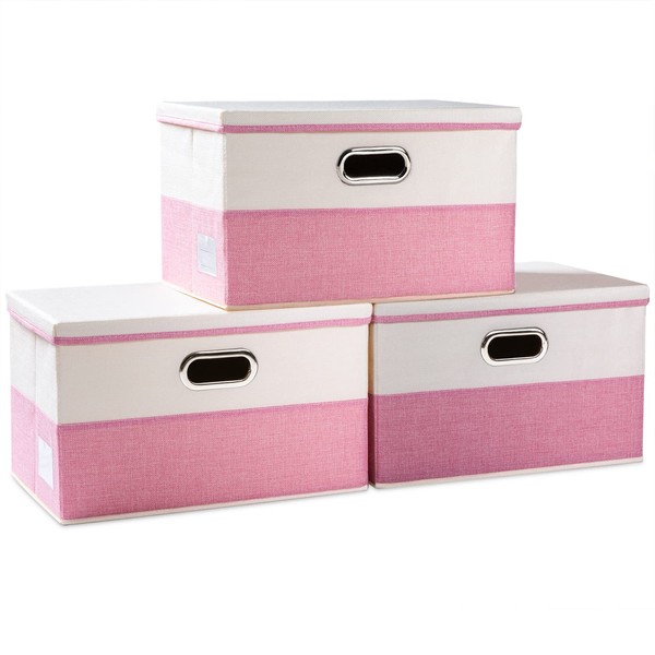 PRANDOM Large Collapsible Storage Bins with Lids [3-Pack] Fabric Foldable Storage Boxes Organizer Containers Baskets Cube with Cover for Home Bedroom Closet Office Pink&Cream(17.7x11.8x11.8)