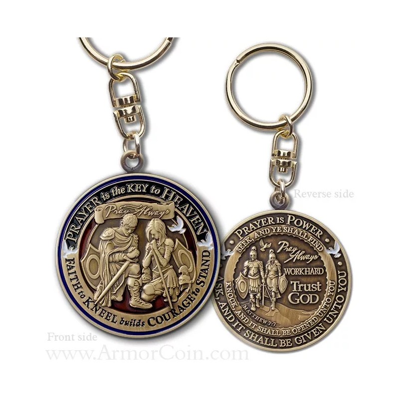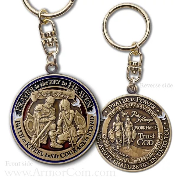 Prayer has been an important part of life from the beginning of the world. We pray for strength; to confess sins and ask forgiveness; for guidance and help; for our families and friends and neighbors; for protection from our enemies. We also pray to express love and to give thanks. With God on our side, the future is bright. The Prayer keytag is carried as a physical reminder not only to pray, but that you are also being prayed for. It encourages faith , courage, and trust in God. It also symbolizes our strength and willingness to go forward with God in our hearts notwithstanding the battle that is being waged. This high relief design incorporates two soldiers (male and female) on side one clothed in armor and kneeling humbly in prayer surrounded by the text 'Prayer is the key to Heaven', 'Pray Always', and the declaration 'Faith to kneel builds courage to stand'. Side two shows the two soldiers proceeding on their way with the conviction to 'Pray Always, Work Hard, and Trust God'. The surrounding text is from Matthew 7:7 "Ask and it shall be given unto you; seek, and ye shall find; Knock, and it shall be opened unto you". Other symbolic design elements are also used to encourage thoughtful pondering. Other symbolic design elements are also used to encourage thoughtful pondering.