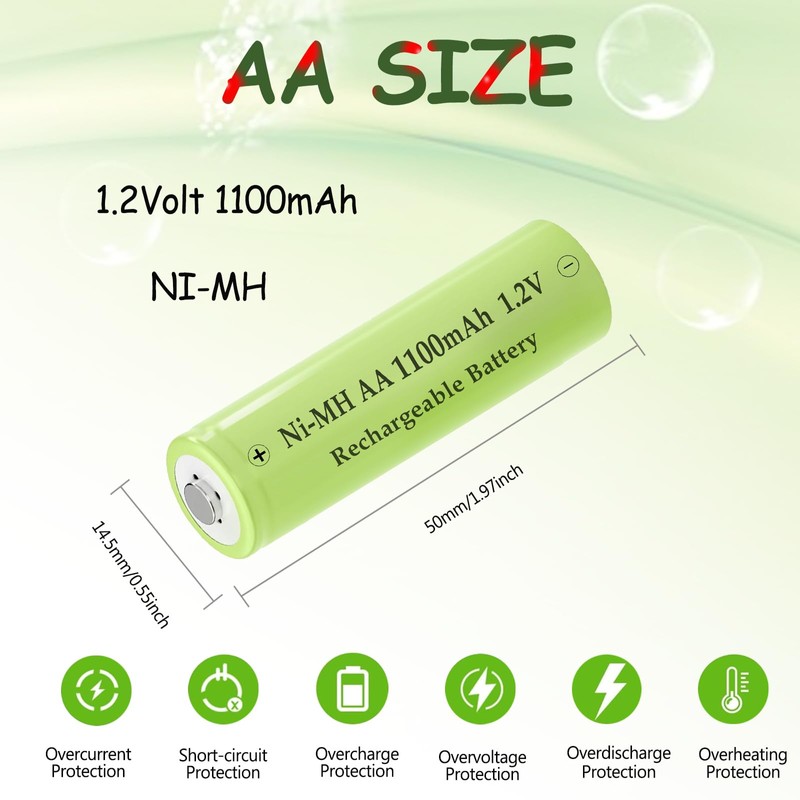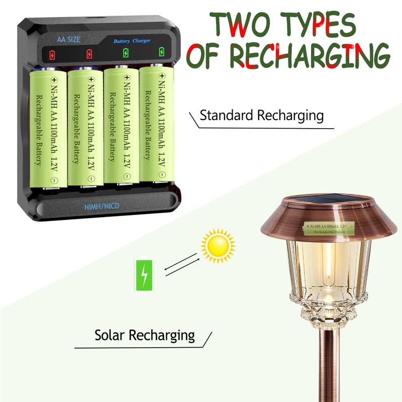 - Convenient Charging: Ni-MH AA 1100mAh rechargeable batteries can be charged by AA battery charger or in solar lights, Solar Ni-MH rechargeable batteries can hold 80% power after 3 years