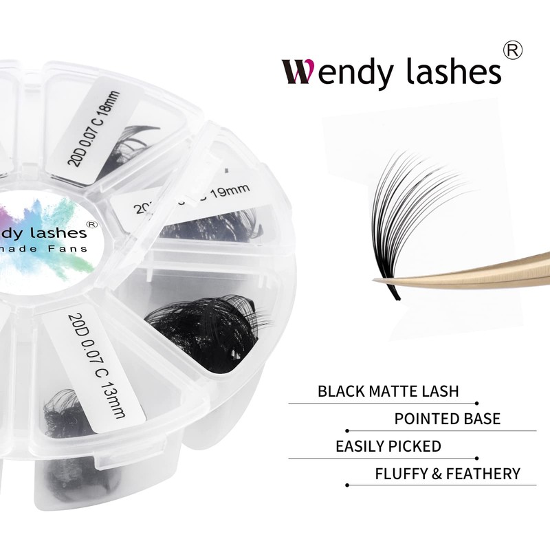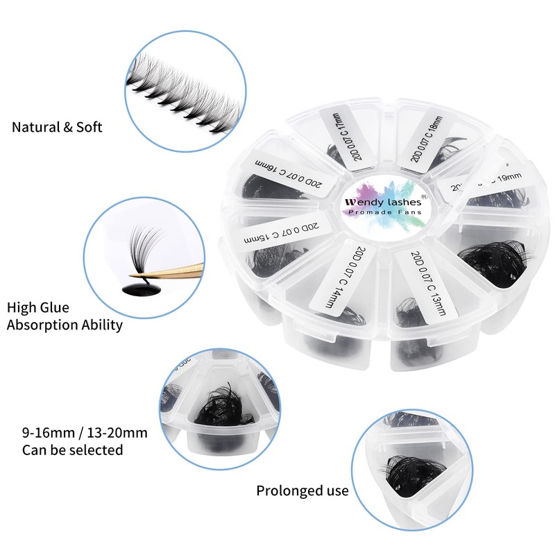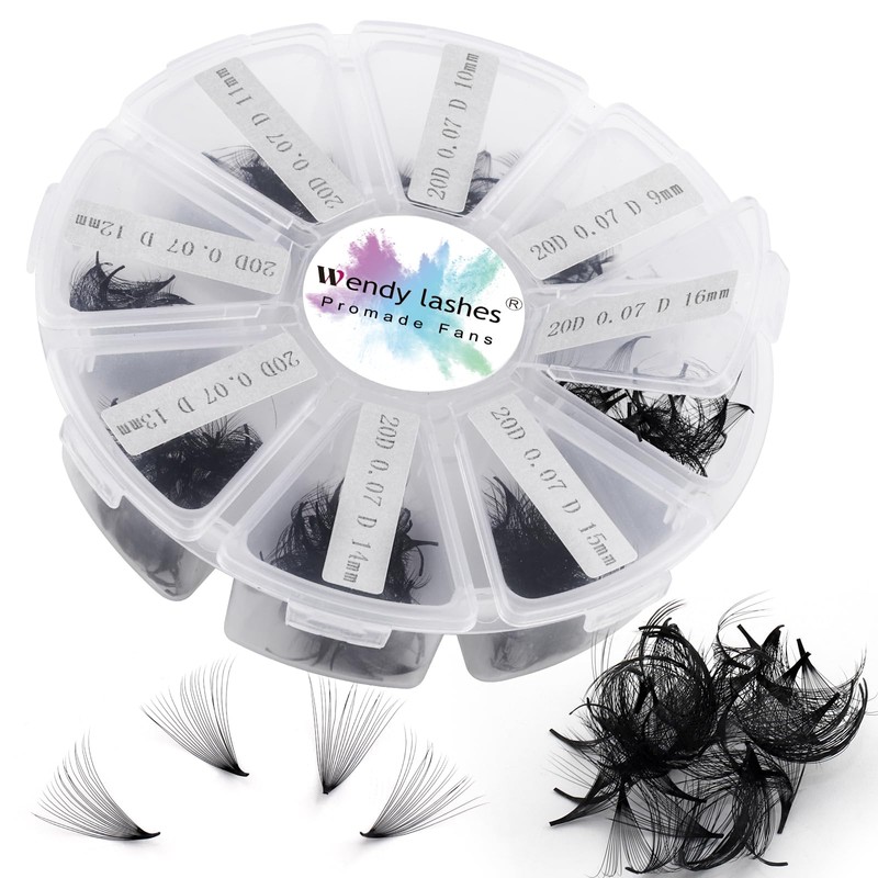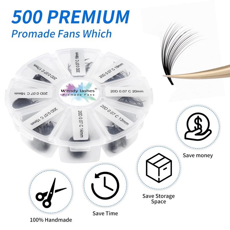 - 1.WendyLashes Pre Made Fans: 500pcs premade fans eyelash extension, 20D 0.07 D Curl 9-16mm. Our premade loose fans provide natural looking curls which help your clients to augment their eyelashes. This easily stands among the best things you can do to help them achieve a truly stunning appearance.
