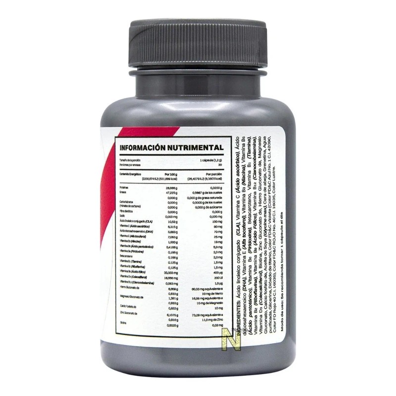 Ácido linoleico conjugado (CLA), Vitamina C, DHA, Vitamina E, Vitamina B5, Vitamina B6, Betacaroteno, Vitamina B1.