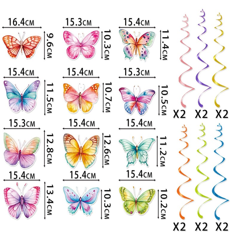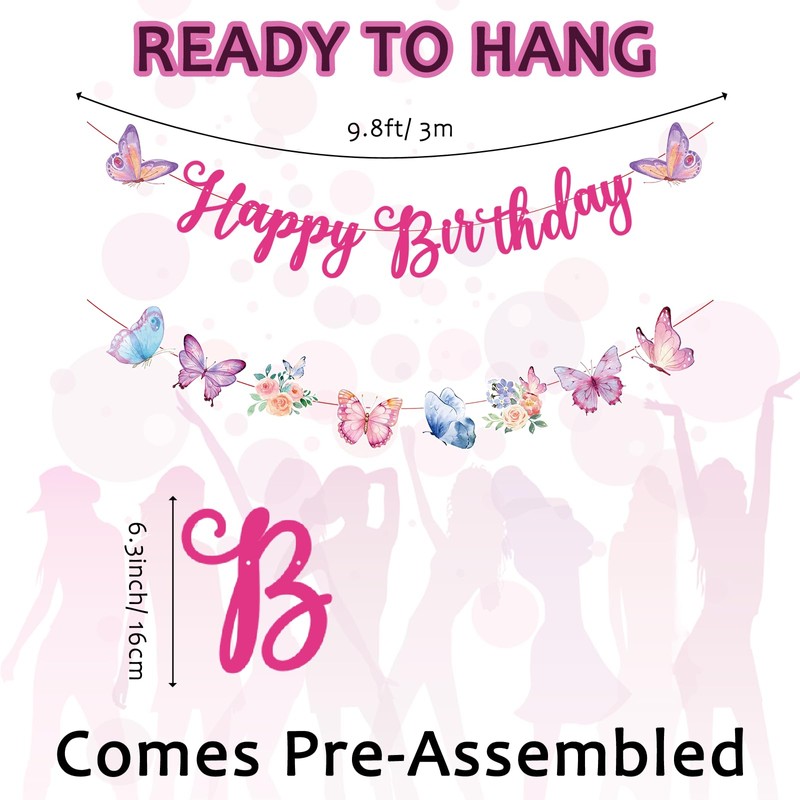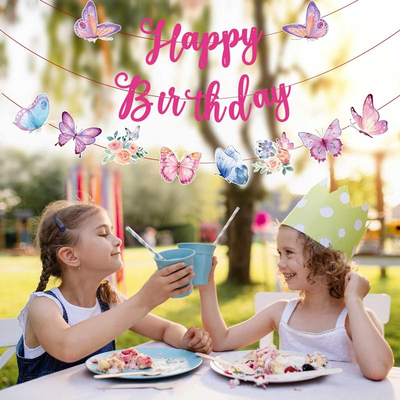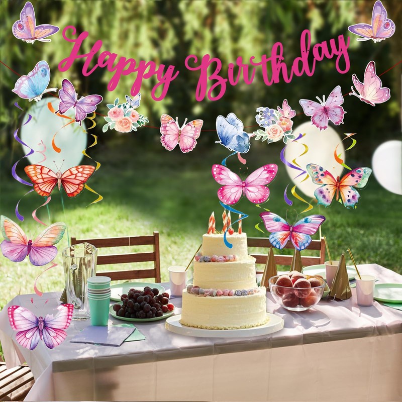 - Complete Butterfly-Themed Decoration Set: Receive 1PCS Pre-Strung "Happy Birthday" banner, 1PCS Pre-Strung Butterfly banner and 12PCS Butterfly hanging swirls. Elevate your birthday party decorations with this super fun and trendy banner!