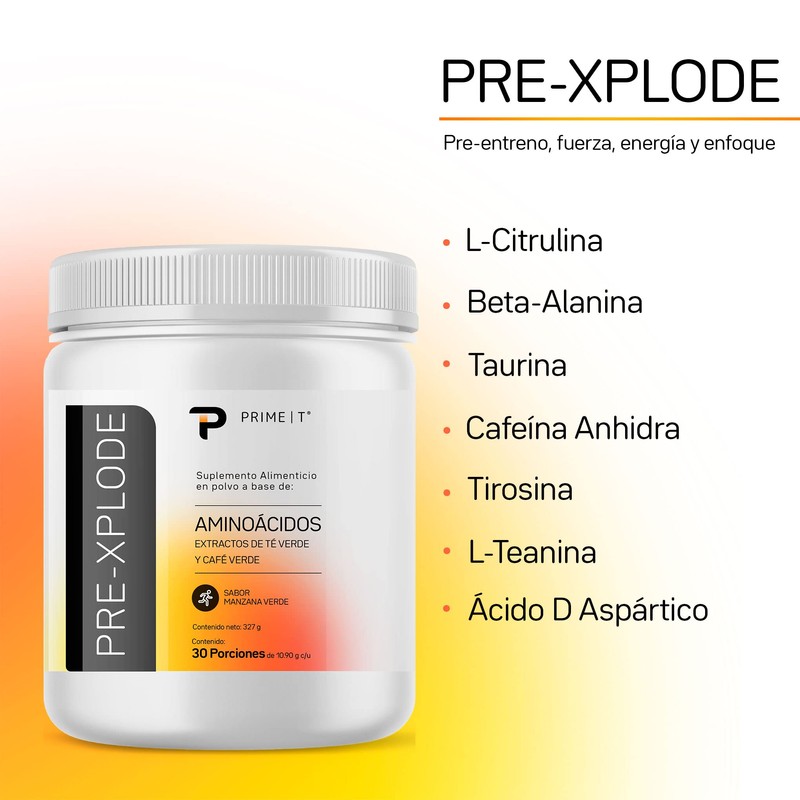 Pre Workout PRE-XPLODE Pre Entreno con malato de l-citrulina, beta alanina, taurina, cafeína, tirosina, l-teanina y ácido d aspártico para realizar entrenamientos con enfoque y fuerza sabor Manzana