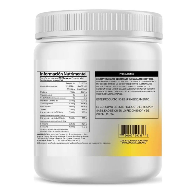 Imagina sentir el poder del Óxido Nítrico corriendo por tus venas, gracias al complejo vaso-dilatador que incluye Malato de L-Citrulina y Beta Alanina. La energía y resistencia no son un problema cuando tienes a Taurina y Cafeína Anhidra de tu lado, mientras que Tirosina y L-Teanina aseguran que tu mente esté tan fuerte como tu cuerpo. 🧠🔥