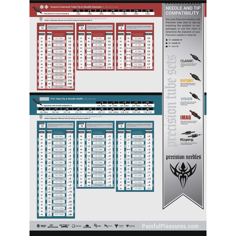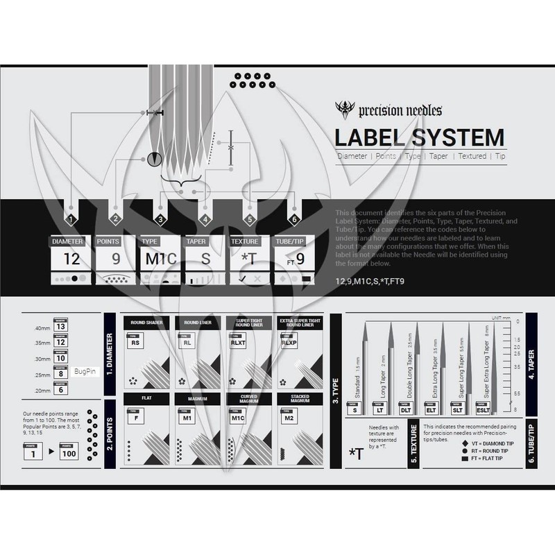 Precision Needles has set the standard for quality and performance of tattoo needles in the industry, providing artists with the sharpest, durable needle points and offering maximum tattoo ink insertion. Precision tattoo needles are manufactured from 304 stainless steel with the addition of tin made with silver, not lead, to ensure the needles bars never rust. Each needle is finished with a fabric wheel, cleaned with water instead of chemicals to remove traces of dust, and polished for the best quality look and performance.