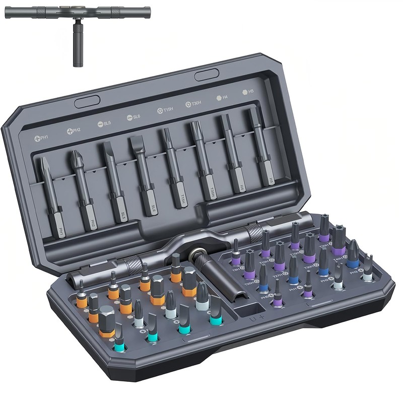 - 【Precision Screwdriver Set】42 precision bits and an adapter are all made of S2 Alloy steel, the hardness can reach HRC60°, The bits undergo a continuous heat treatment process, ensuring excellent hardness, durability, and toughness without brittleness. The set features 32 short 25mm bits in various types such as PH (4), SL (4), Torx (10), Hex (9), PZ (3), and U-shaped (2), along with 8 long 45mm bits.