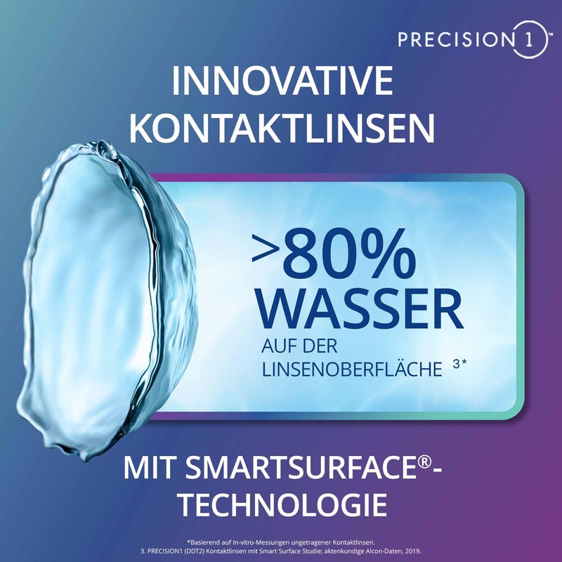 • PRECISION1 contact lenses feature SMARTSURFACE technology - a powerful moisture layer [2] on the lens surface that consists of more than 80 percent water [2]