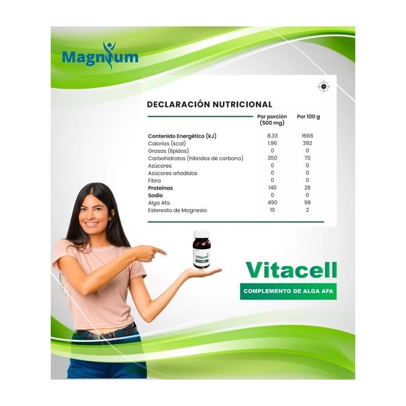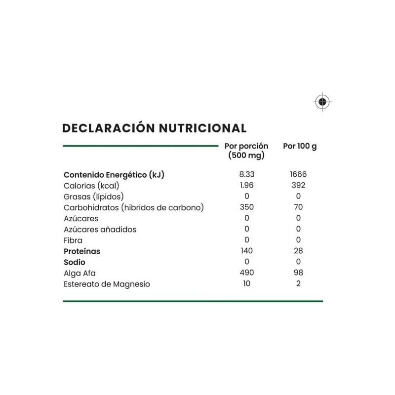 - >>Ingredientes: Alga Alfa, Estereato de magnesio. Cápsula a base de Gelatina dura.