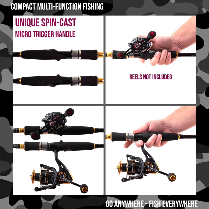 • UNIQUE MULT-FUNCTION ROD. Unique Micro-trigger handle. The only lure rod series with a micro trigger to change from spin casting to bait-casting on the same rod. The 4 section travel rod, with extension section, has hybrid steel/ceramic eyes allow for spin fishing and bait-cast fishing methods