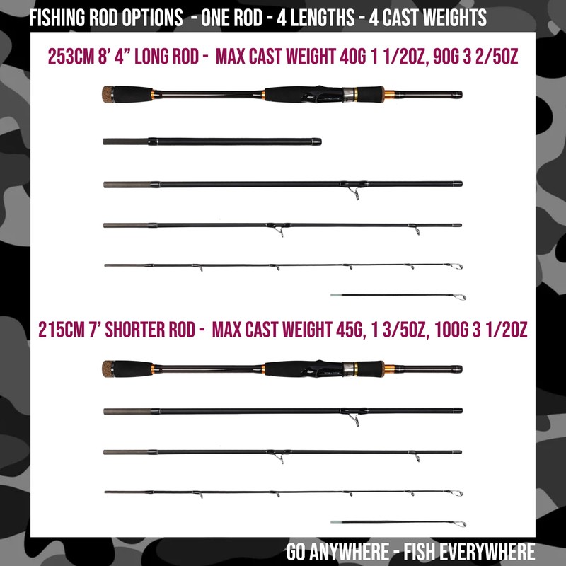 • ROD SPEC The big brother of the Predator Series. Unique Spin-Baitcast Powerful Fishing Rod, with Unique Micro Trigger. 4 compact Hi-Carbon Cast Spinning pole, make it ideal for travel anglers, with extra extension section and 2 tips to offer 4 fishing rod lengths 253 cm 8’4”, 220 cm 7’3”, 215cm 7’, 1.85cm 6’. Max cast weight 253cm Rod - 40g 1 1/2oz, 90g 3 2/5oz. 215cm Rod - 45g, 1 3/5oz, 100g 3 1/2oz