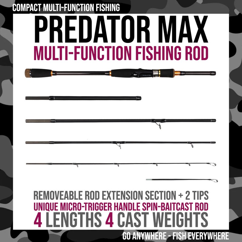 Predator Max. Unique Spin-Baitcast Rod + Micro Trigger + Rod Extension. Multi-Function Powerful Rod - 4 Lengths & 4 Cast Weights