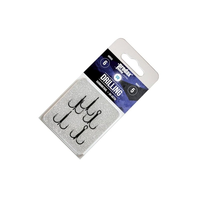 Predax UV drilling black - treble hooks - The predator fish triplets from Predax are very good hooks for spin fishing, which can be mounted on both blinkers and wobblers as well as on stinger hooks for rubber bait. The triplets are UV-active and very stable, so that they can withstand the drill with capital predatory fish.