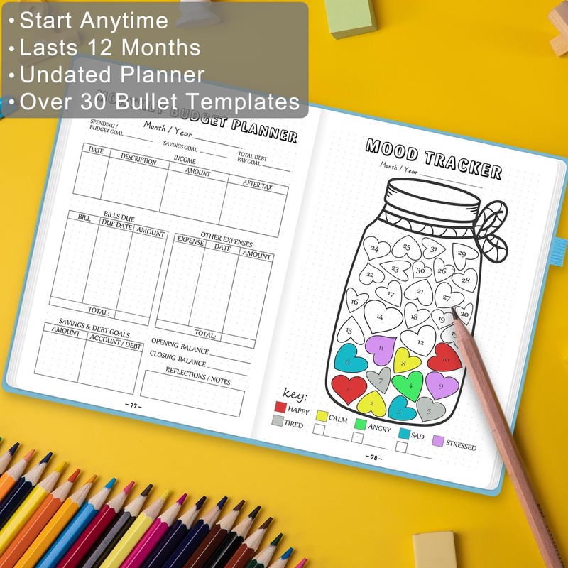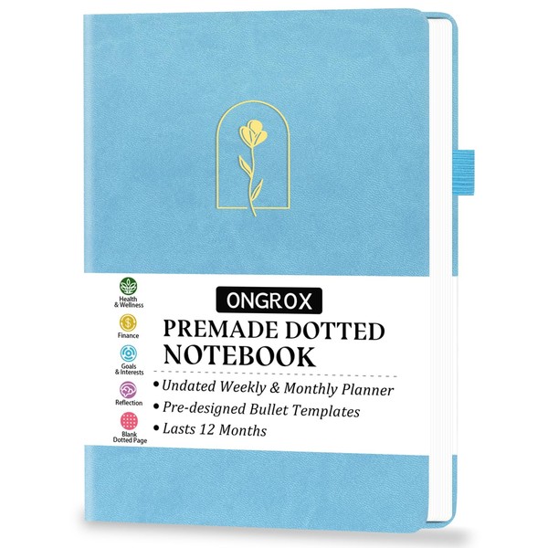 Premade Bullet Style Notebook with Undated Weekly & Monthly Planner, Dotted Journal with Pre-made Bullet Planner Stencils, Dot Grid Journaling with Habits & Mood Tracker, 12 Month Organization, A5